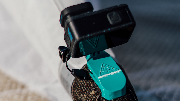L’idée vient d’un client qui cherchait un nouveau point de vue pour se filmer et ne trouvait pas vraiment son bonheur sur le marché. Pour te le présenter en quelques mots : il s’agit d’un support fixé sur le bout de la latte centrale de la wing, maintenu par un dyneema avec un tendeur intégré qui fait également office de leash.
